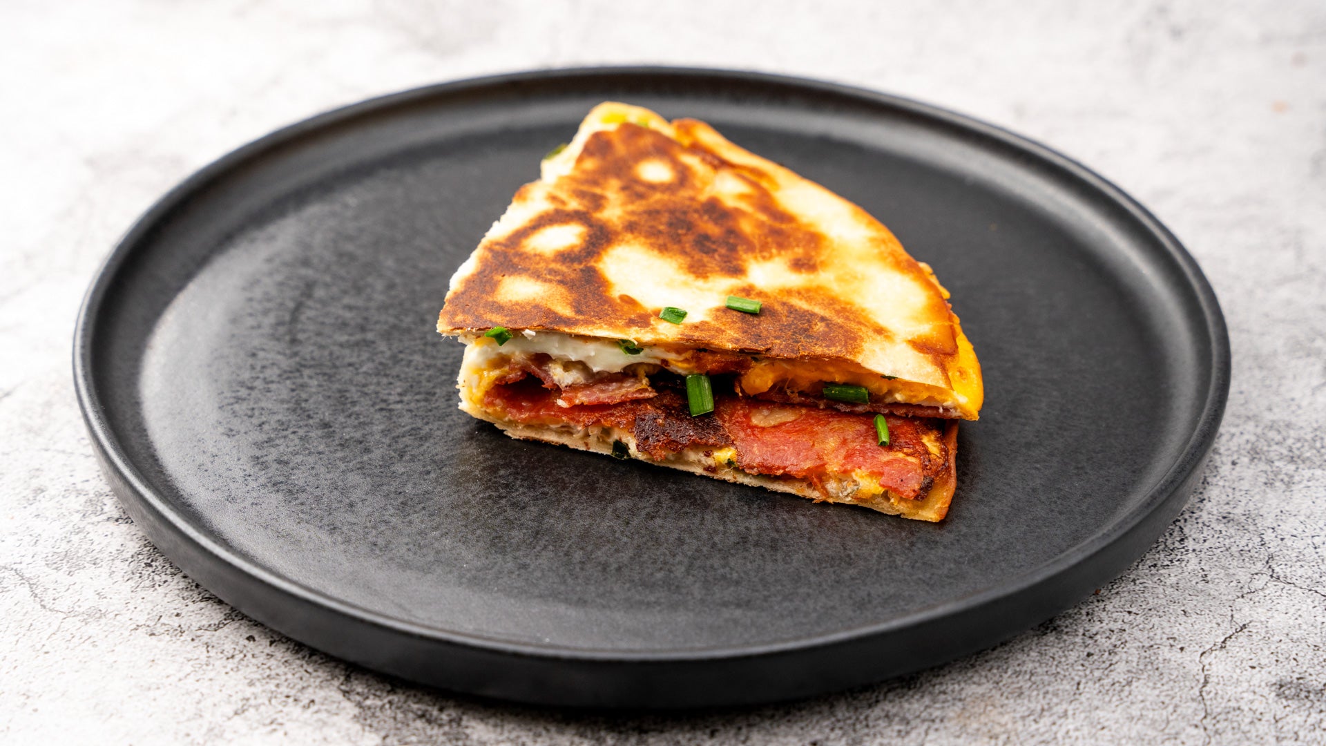 Schnittlauch waschen, trocknen und in Stifte schneiden. Die Hälfte vom Schnittlauch über die Eier streuen und mit Gewürzsalz und Scharfes Gewürz würzen. Alles mit einer Tortilla bedecken, diese leicht andrücken. Nun die Eier bei niedriger Hitze stocken und den Käse schmelzen lassen. Frühstückstortilla anschließend in der Pfanne wenden, Hitze erhöhen, 1 EL Mango-Chili-Öl um die Tortilla träufeln und diese von unten goldbraun rösten.