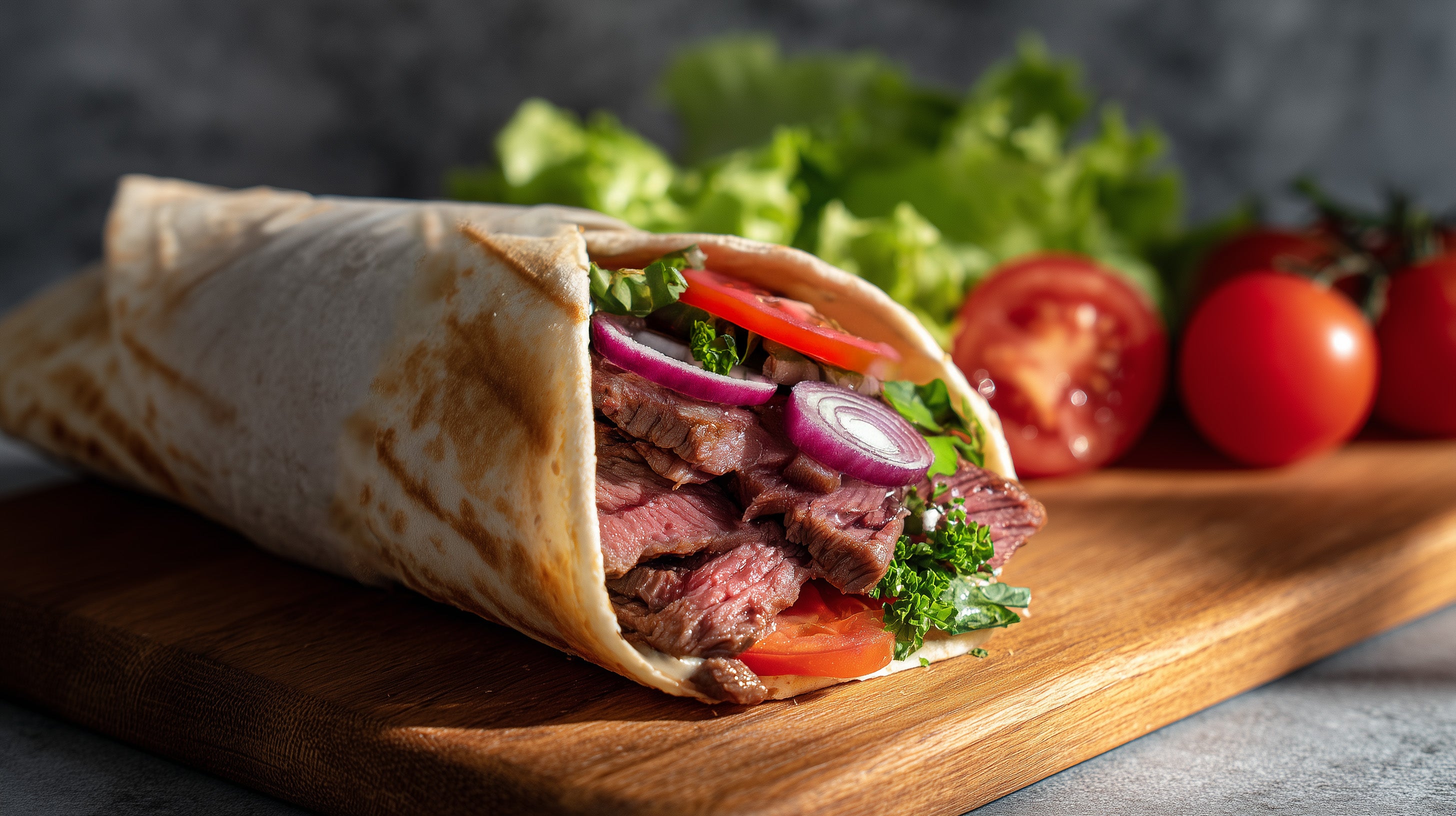 Zum Anrichten Dürüm mit Fleisch, Joghurtdip, Petersilie, Salat und Tomaten füllen, zusammenrollen und genießen.