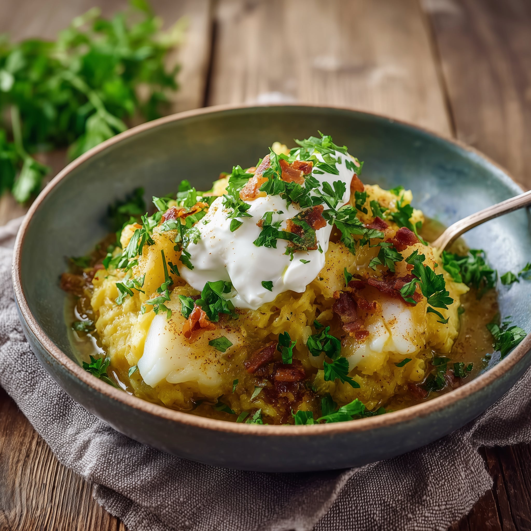 Topf vom Herd nehmen, alles mit einem Kochlöffel durchrühren und mit einem Kartoffelstampfer zerstampfen. Stampf auf zwei Tellern anrichten und jeweils 1-2 EL Schmand daraufgeben. Petersilie fein hacken und über das Stampf streuen.