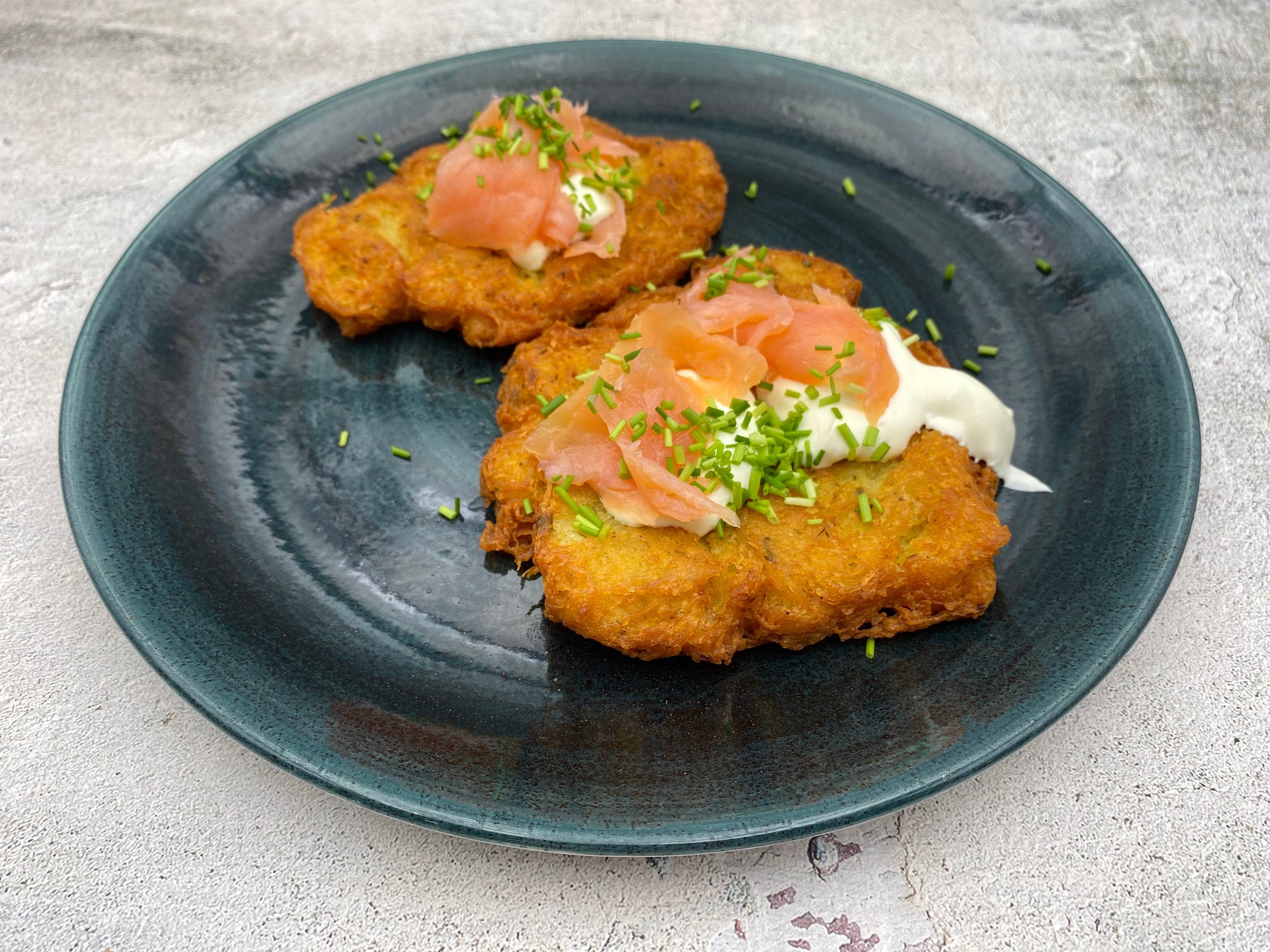 Ordentlich Bratöl in einer Pfanne erhitzen, sodass die Reibekuchen später „im Fett schwimmen“ können. Dann Reibekuchenmasse portionsweise in die Pfanne geben und zu Reibekuchen formen. Bei hoher Hitze im heißen Öl ausbacken, bis sich die Reibekuchen vom Pfannenboden lösen und „im Fett schwimmen“. Anschließend die Reibekuchen wenden und von der anderen Seite weiterbraten, bis sie von beiden Seiten goldbraun sind. Ggf. die Reibekuchen am Ende noch mal wenden und noch mal von der anderen Seite braten. Reibekuchen aus der Pfanne nehmen und ca. ½ Minute auf Küchenpapier abtropfen lassen. Mit Topping nach Wahl servieren.