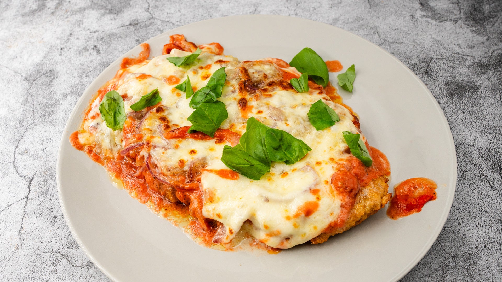 Schnitzel nebeneinander auf einen Servierteller legen. Die geschmolzene Mozzarella-Tomatensauce aus dem Ofen nehmen und über beide Schnitzel schieben. Mit Basilikum garnieren und servieren.