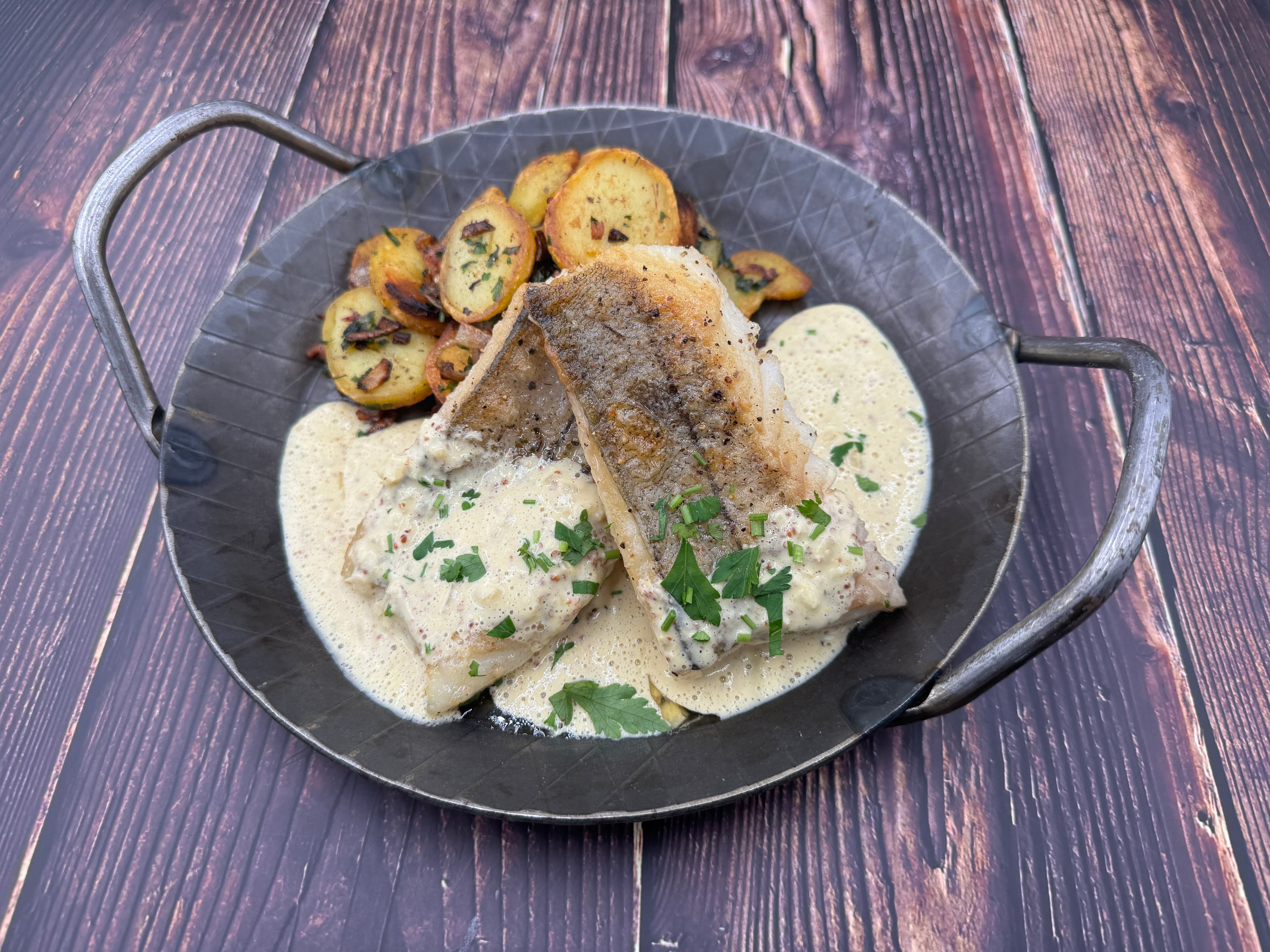 Pannfisch mit Bratkartoffeln und Senfsauce