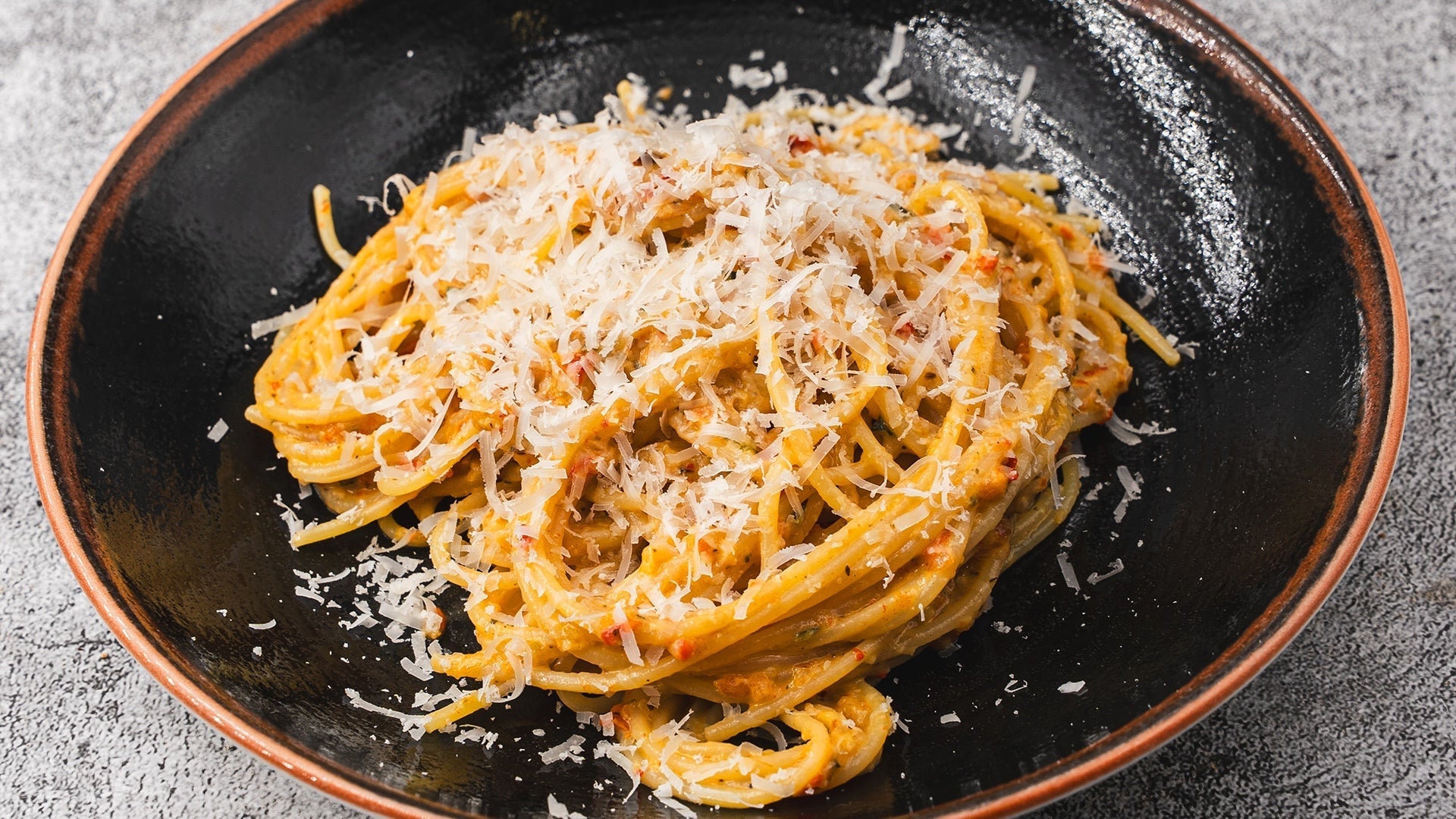 Spaghetti und Sauce in einer Pfanne oder einem Topf vermengen, anschließend auf zwei Teller verteilen und Parmesan darüber reiben.