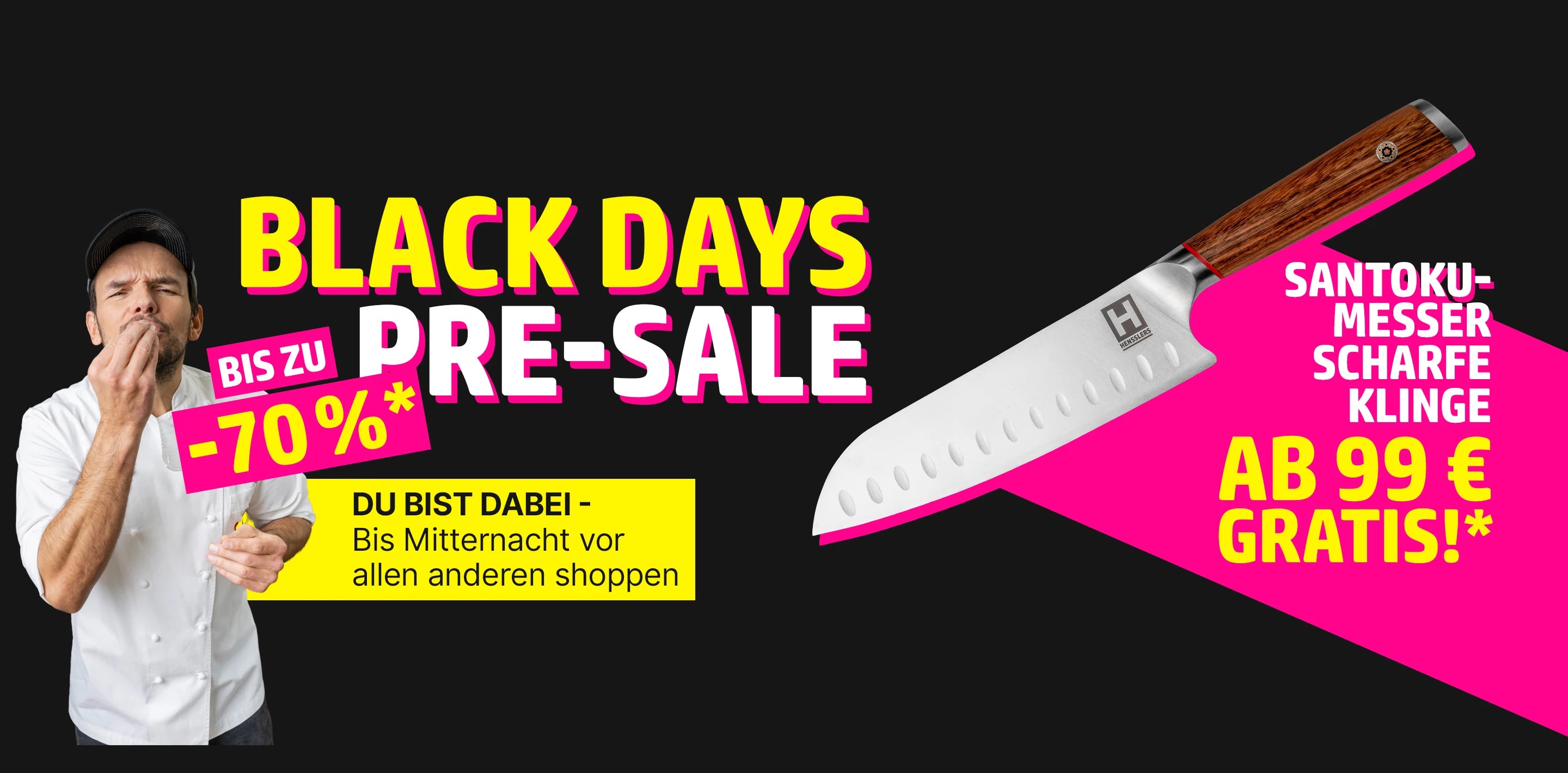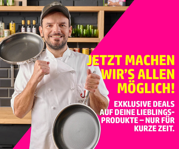 Und das Beste: Ab 99€ Einkaufswert erhältst du unser neues HENSSLERS Santokumesser "scharfe Klinge" GRATIS dazu! Also: Lieblingsprodukte sichern, clever kombinieren und dein Küchen-Upgrade zum unschlagbaren Preis genießen.