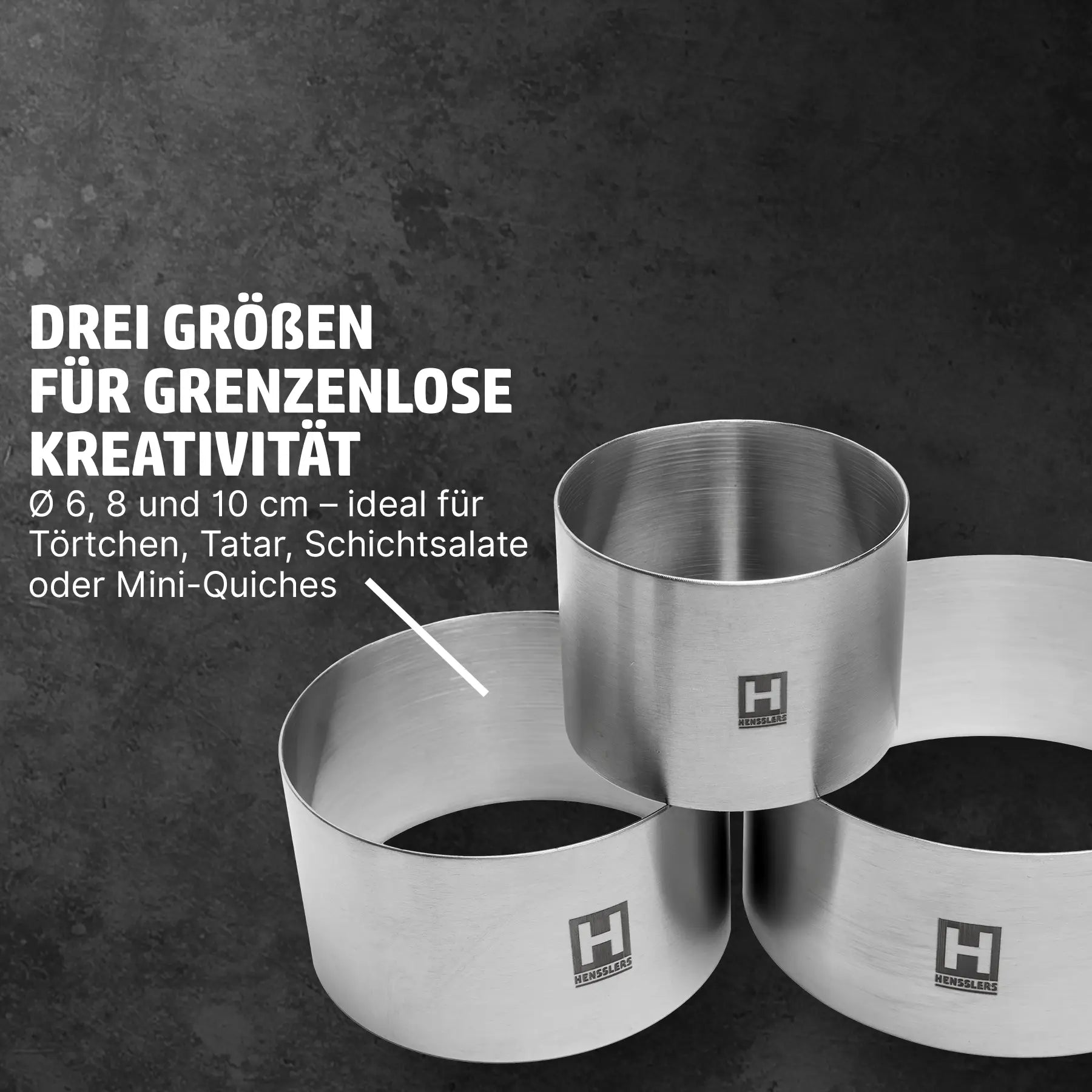 Mit dem HENSSLERS Backring Set gelingen dir Desserts, Vorspeisen und Mini-Kuchen wie vom Profi. Die drei Backringe aus hochwertigem, rostfreiem Edelstahl sorgen für perfekte Formen und eine stilvolle Präsentation in deiner Alltagsküche.