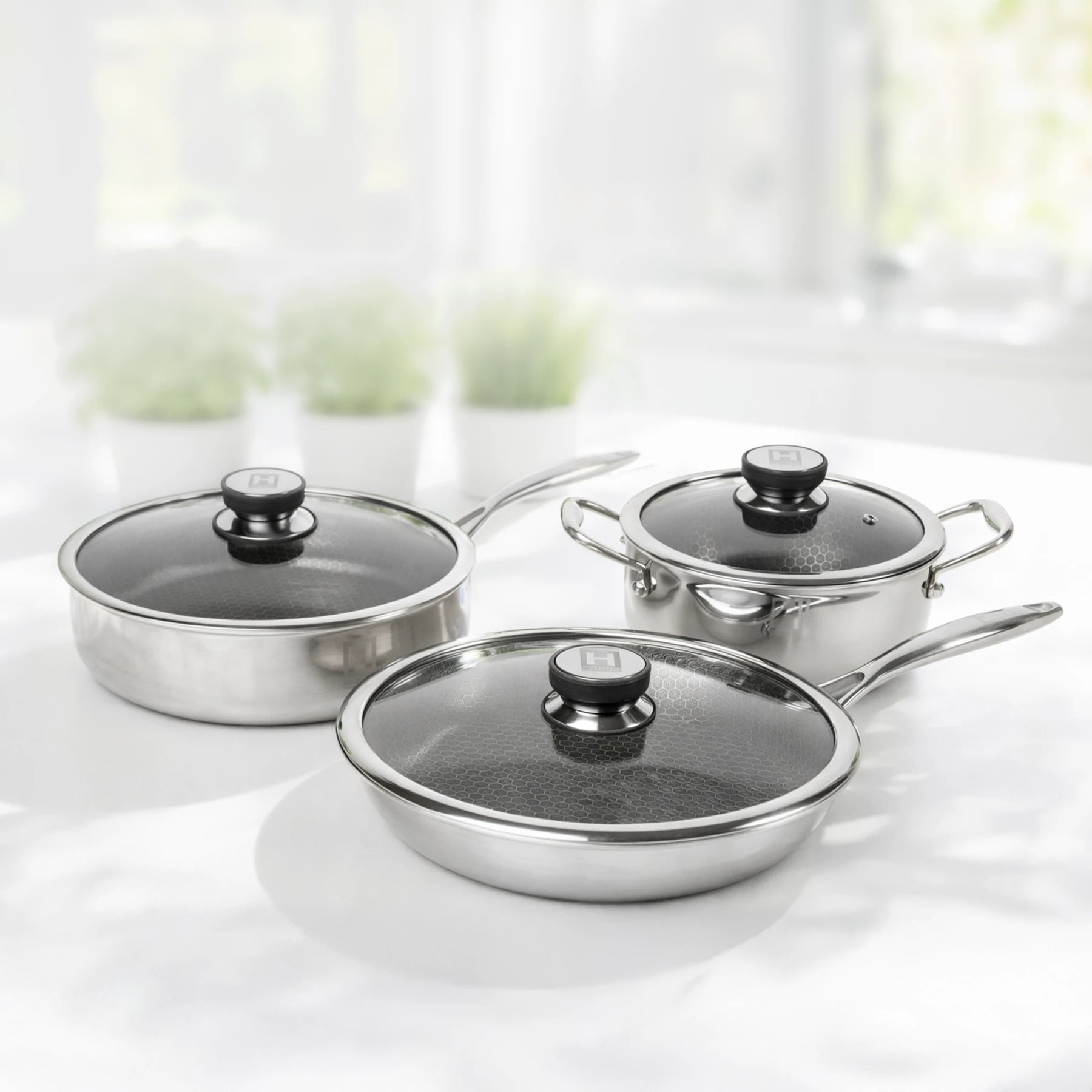 Die HENSSLERS Sautépfanne besteht aus einem Mehrschichtmaterial mit innovativer Wabenstruktur. Diese Kombination ermöglicht