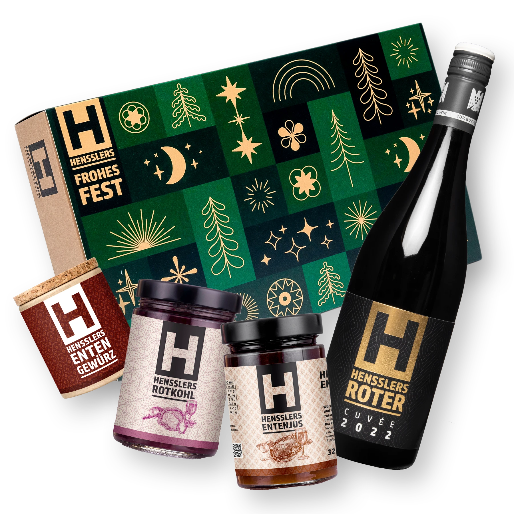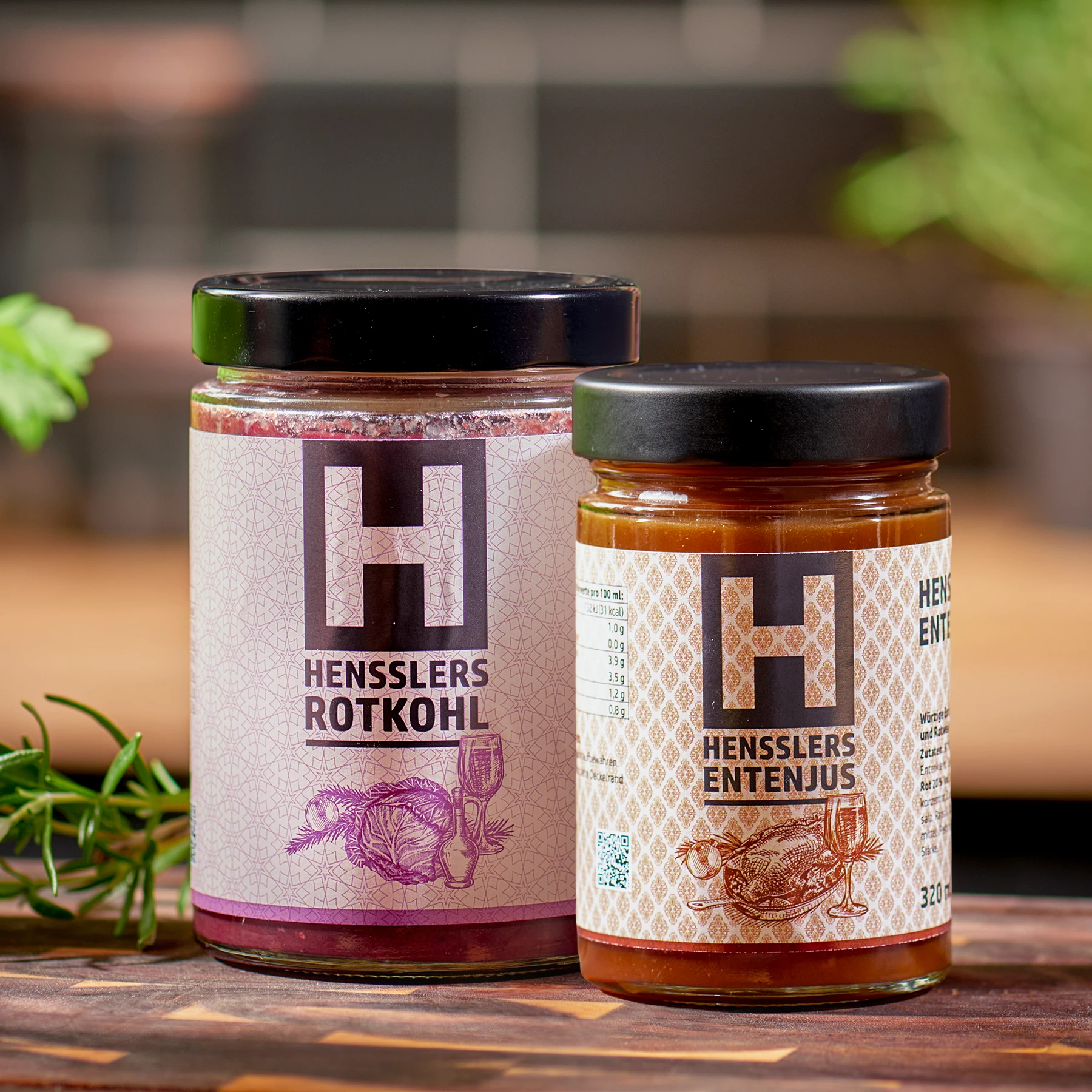 Hensslers Festtagsset Deluxe - Verwandelt deine Festtage in ein kulinarisches Highlight! Mit einer harmonischen Kombination aus Hensslers Roter, Rotkohl, Entenjus und Entengewürz liefert dieses Set alles, was du für ein unvergessliches Festessen brauchst.