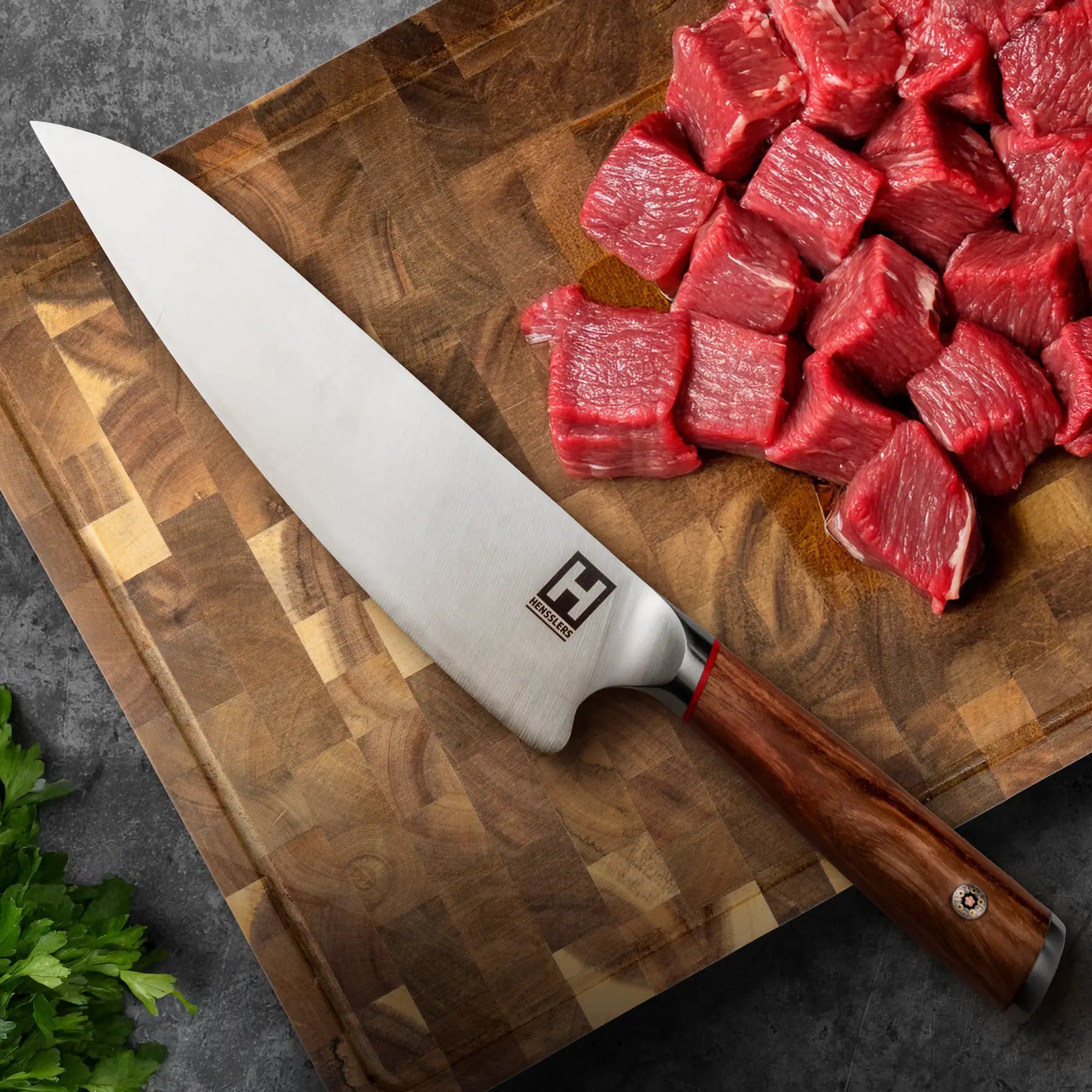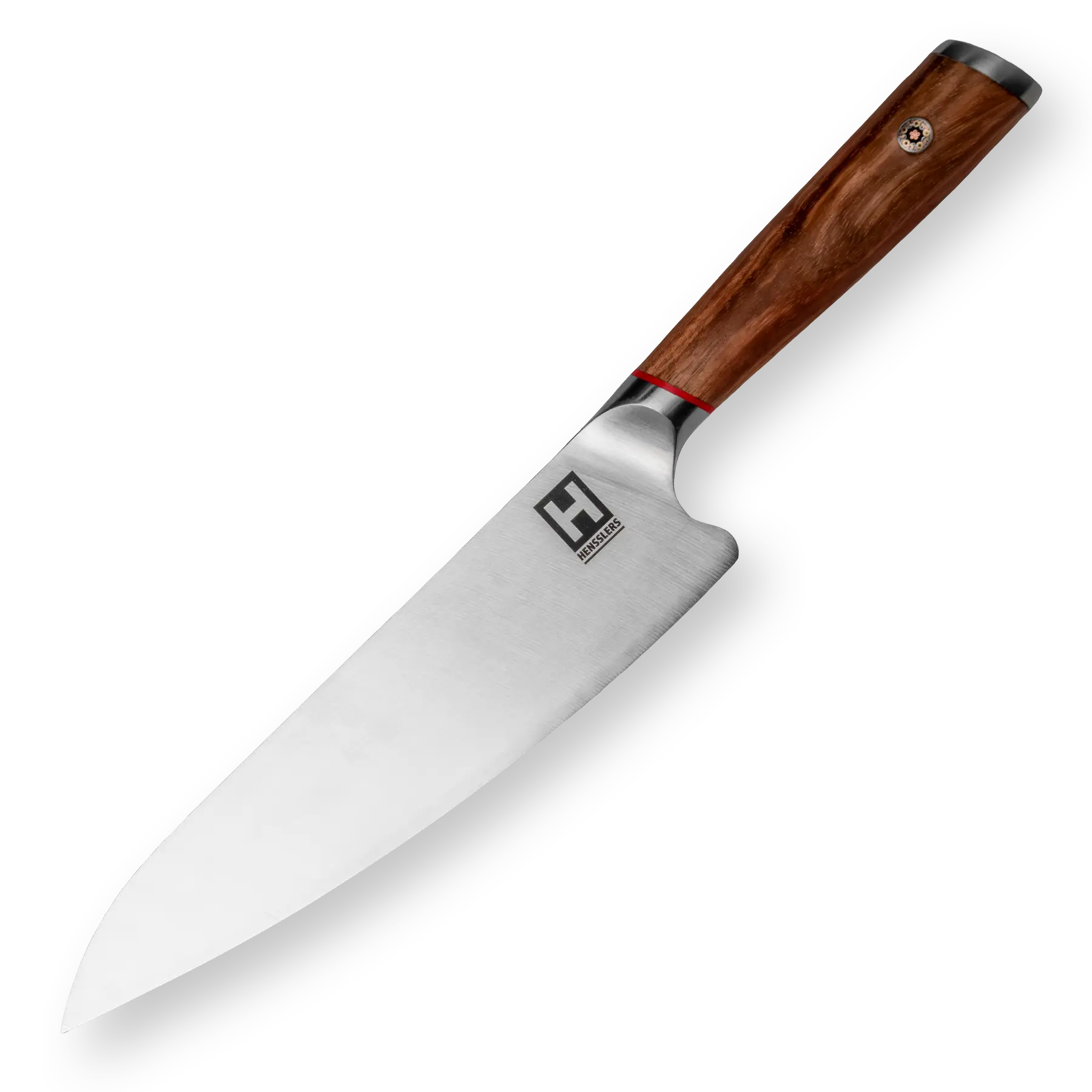 HENSSLERS „Scharfe Klinge“ Kochmesser – das Herzstück jeder Küche. Mit seiner 19,8 cm langen, leicht gebogenen Klinge ist es der ideale Allrounder für Fleisch, Fisch, Gemüse und Kräuter.
