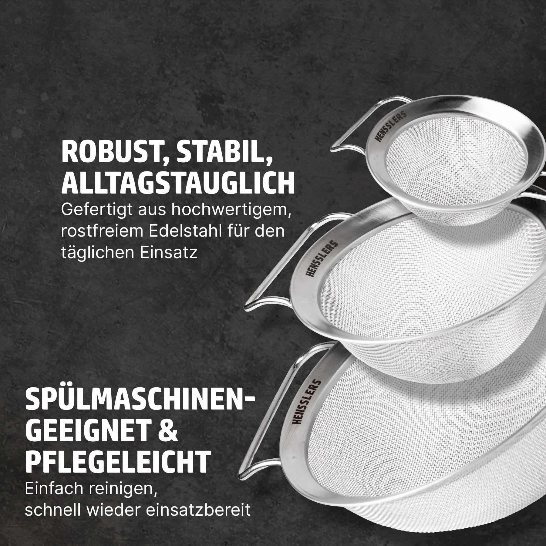 Das HENSSLERS Küchensieb 3er Set ist der vielseitige Küchenhelfer für deine Alltagsküche. Ob Pasta abgießen, Gemüse waschen oder Saucen passieren – mit drei praktischen Größen (Ø 20 cm, 14 cm, 10 cm) hast du für jede Aufgabe beim Kochen das passende Sieb zur Hand. Gefertigt aus hochwertigem Edelstahl, verbindet dieses Küchensieb-Set Funktionalität mit langlebiger Qualität.