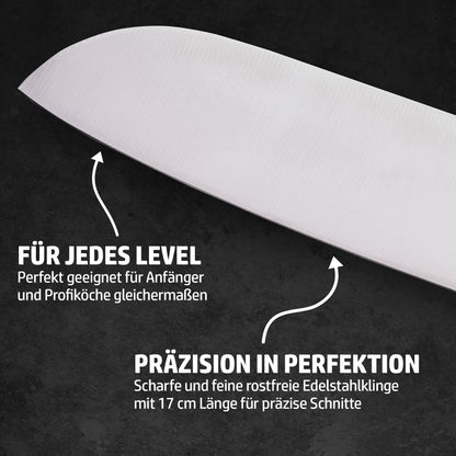 Das japanische Profi-Messer mit 17 cm Klingenlänge ist perfekt zum Schneiden, Hacken und Wiegen – ein echtes Must-have für jede Küche.