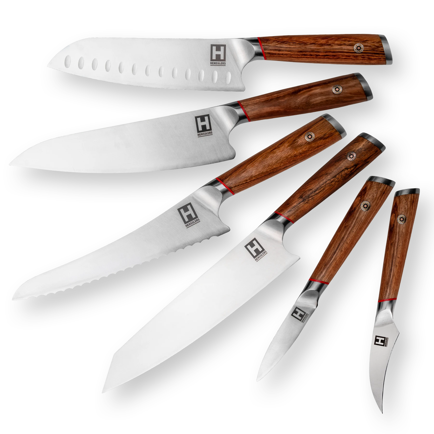 Alle Klingen bestehen aus hochwertigem, rostfreiem Edelstahl und verbinden extreme Schärfe mit Stabilität und langer Schnitthaltigkeit. Die ergonomischen Griffe aus handverlesenem Zebrawood (Zebrano) mit rotem Akzent und verzierter Rosette sorgen für optimale Balance und ein warmes, angenehmes Griffgefühl. Das 6er Set ist die ideale Komplettlösung für ambitionierte Köche – leistungsstark, durchdacht und edel in der Optik.