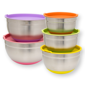 Das Mehrfarbenkonzept der Deckel hilft nicht nur dabei, die Größen zu unterscheiden, sondern auch die Lebensmittel luftdicht und lange haltbar zu verschließen. Der Silikonboden verhindert lautes Klappern und unterstützt die Stabilität der Rührschüsseln beim Rühren, Mixen und Mischen von Zutaten – Rutschfestigkeit at its best.