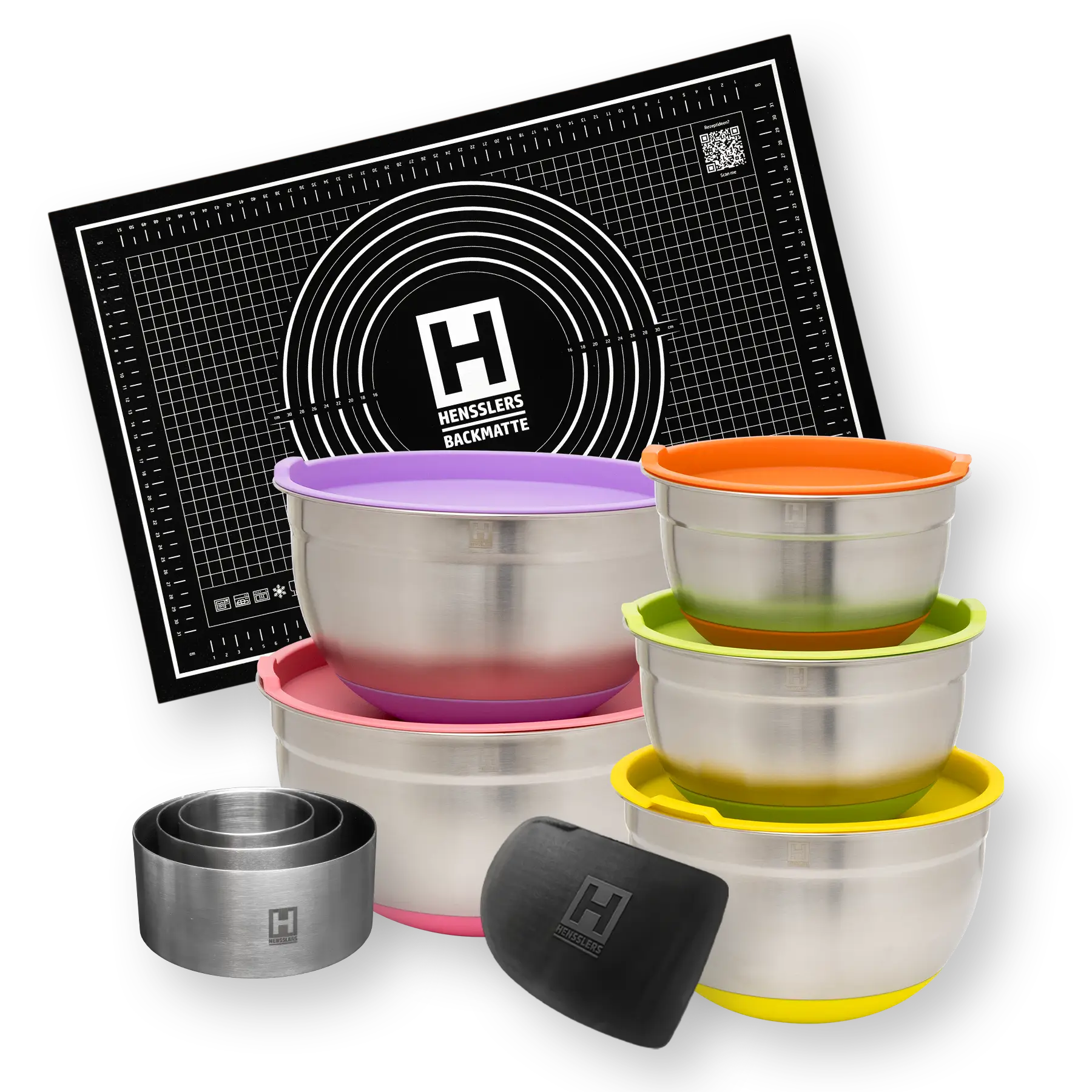 HENSSLERS 5er Schüsselset – Schüsselset aus Edelstahl mit rutschfestem Silikonboden und luftdichtem Deckel Online kaufen. Ideal als Rührschüssel, Salatschüssel oder Obst- und Müslischalen einsetzbar.
